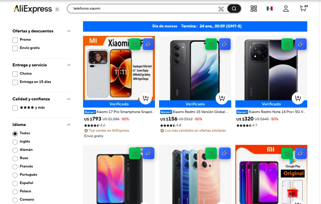 AliExpress, en lo que respecta a celulares, es un líder global. Dentro de su plataforma puedes encontrar más de 15 millones de teléfonos móviles disponibles para compra, lo que la convierte en una de las ofertas más amplias del mercado.
